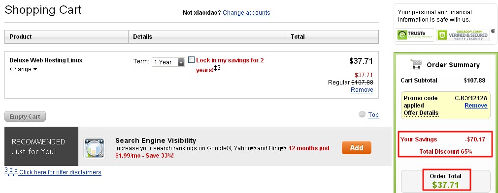 看到没有,Deluxe方案一年仅需要37.71美元,折合人民币一年也只需要240元。然后换算到月,再折到每天。。。。。。怎么样,现在对Godaddy这次降价幅度之低有概念了吧。