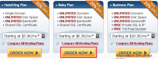 二、HostGator的虚拟主机提供Hatchling Plan 、Baby Plan、Business Plan三种方案,这里以购买第二种Baby Plan方案一年期为例。我们点击要购买方案下方的”ORDER NOW”开始购买
