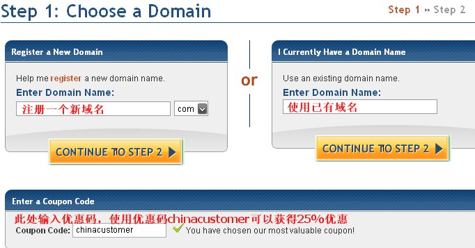 三、如图,进入下图所示界面。可以选择注册一个新域名或者是使用已有域名。如果你有优惠码。可以输入优惠码。然后点击”CONTINUE TO STEP 2″继续下一步。