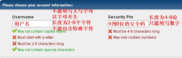 五、填写用户名和安全码。用户名要求是2-8个字符长度,以字母开头,不能填写大写字母和特殊字符。安全码要求是4-8个字符长度,只能使用数字。安全码后期验证账户时需要使用到,所以不要胡乱填写。