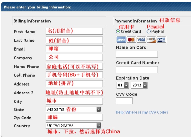 六、继续填写账单信息,包括个人信息和付款信息,个人信息中建议先将最后一个country选择为China。付款信息是让用户选择付款方式是信用卡还是Paypal,并且填写基本信息。