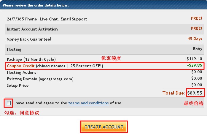 八、最后可以看到如下图所示的界面。这里显示的是当前购买产品的基本信息。我们可以看到当前主机的方案、价格、优惠额度以及最终价格等。这里使用的优惠码是chinacustomer,这枚优惠码的优惠幅度是25%。更多优惠码信息参考HostGator优惠码。确认之后点击”CREATE ACCOUNT”创建账户。