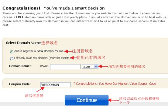 二、进入域名信息填写界面。根据要求和自己的情况进行填写,是新注册域名还是使用已有域名。如果你有优惠码,也可以在相应的地方填写优惠码