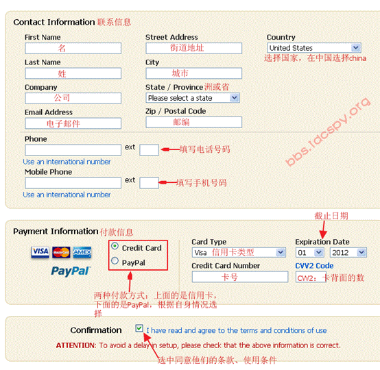 三、填写好之后,点击”Continue”进行相关信息填写页面。填写个人信息以及付款方式等,如下图所示,根据提示填写即可。