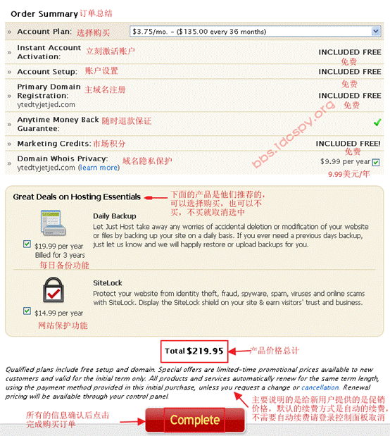 四、选择主机产品的购买周期以及其他相关产品,这些都是根据自己的情况进行选择。完成之后,点击”Complete”按钮完成订单。